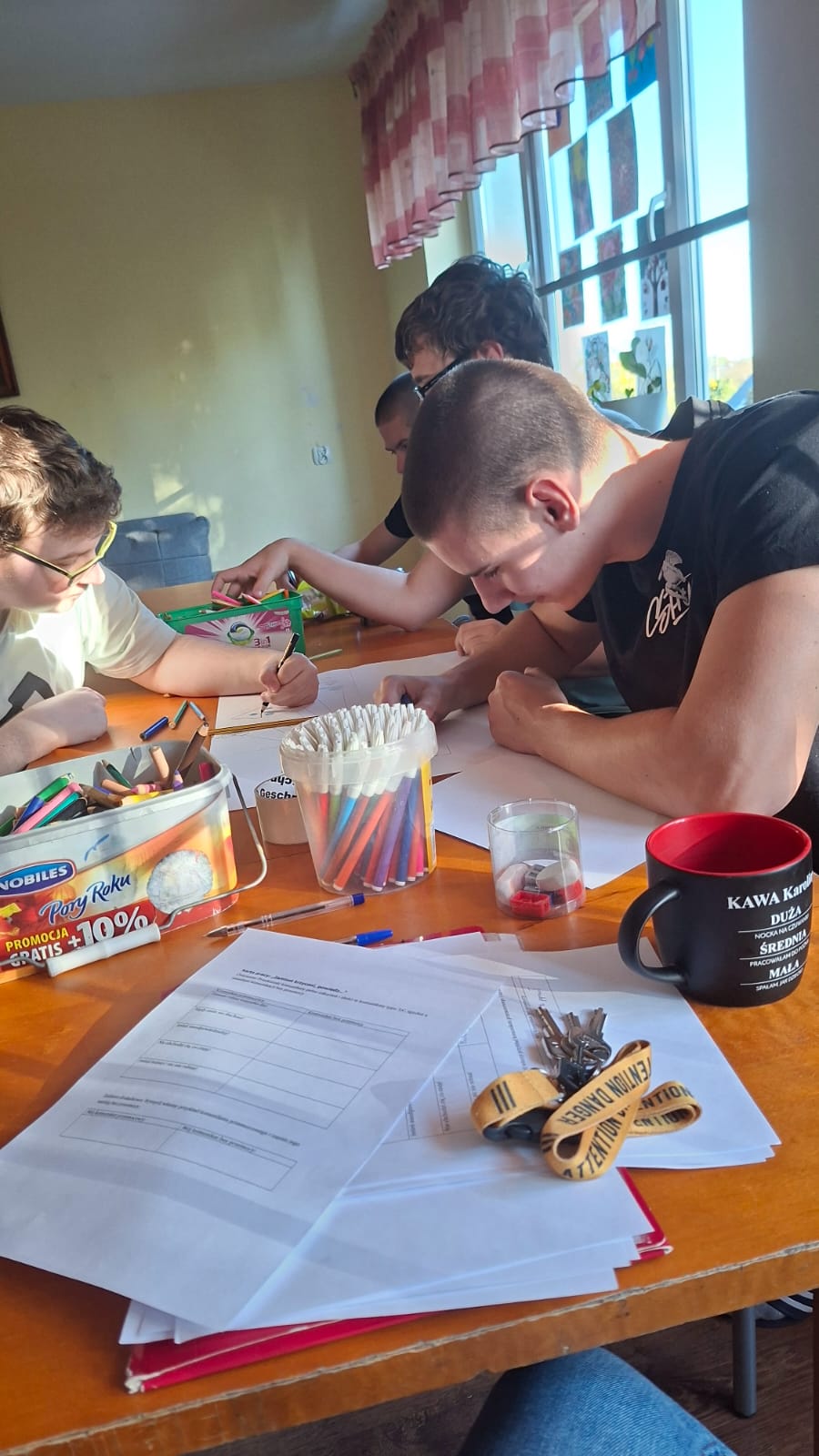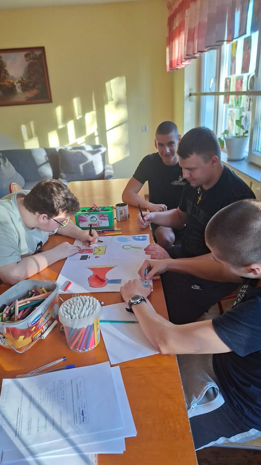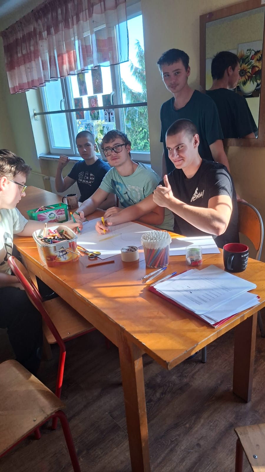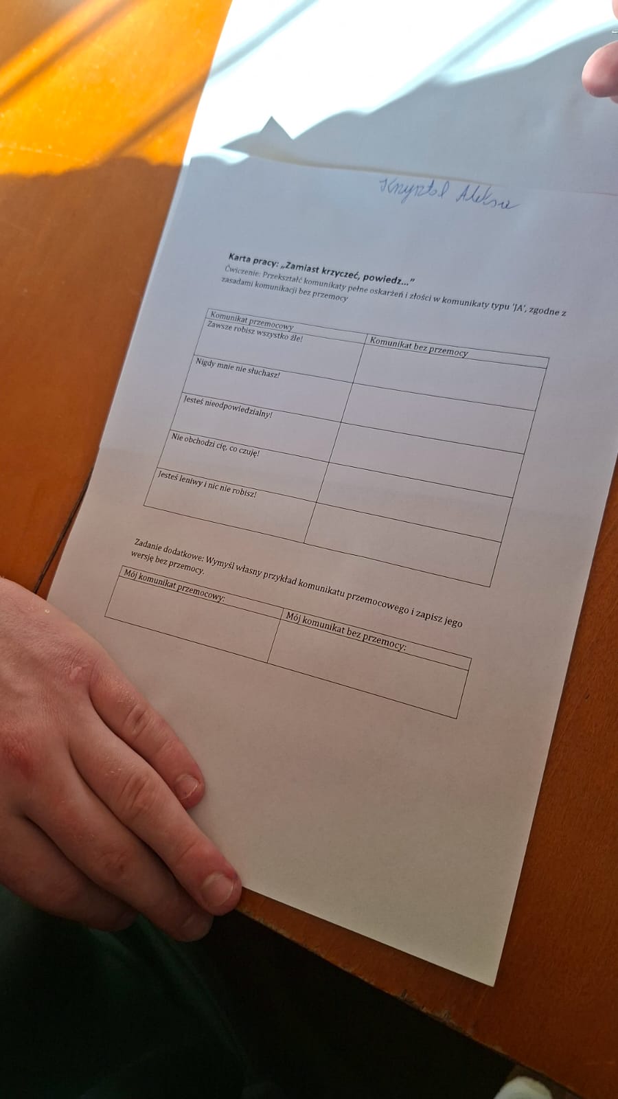 Podczas zajęć prowadzonych przez wychowawcę Karolinę Grabowską uczniowie poznawali zasady komunikacji bez przemocy (NVC), ucząc się wyrażania emocji w sposób pełen szacunku i empatii. Chłopcy dyskutowali o tym, co oznacza dobra komunikacja, ćwiczyli przekształcanie komunikatów nacechowanych oskarżeniami w komunikaty typu „ja” oraz wspólnie stworzyli plakat prezentujący różne narzędzia efektywnej komunikacji.