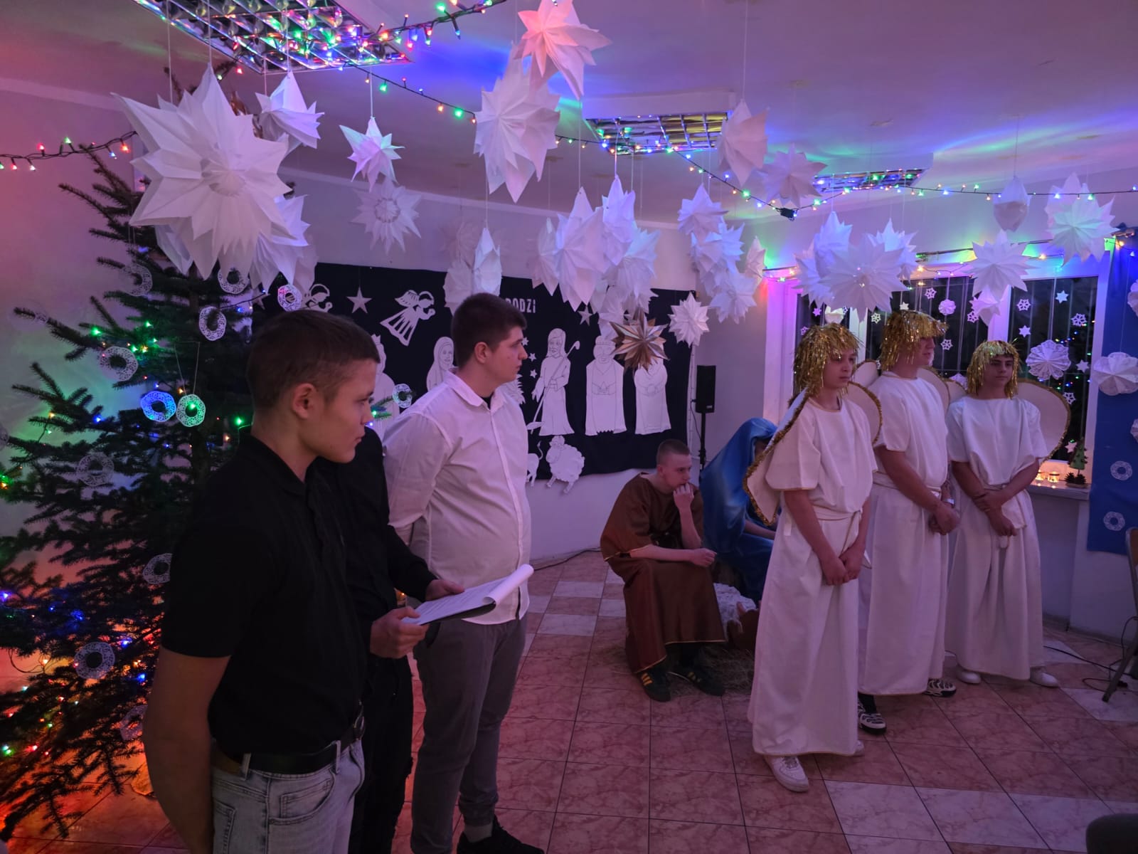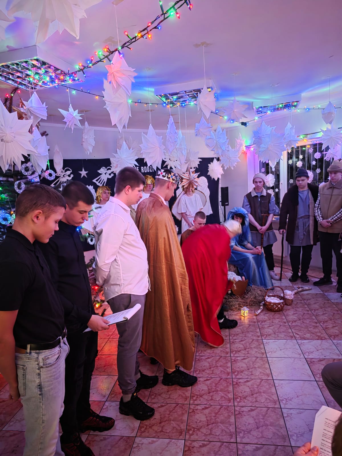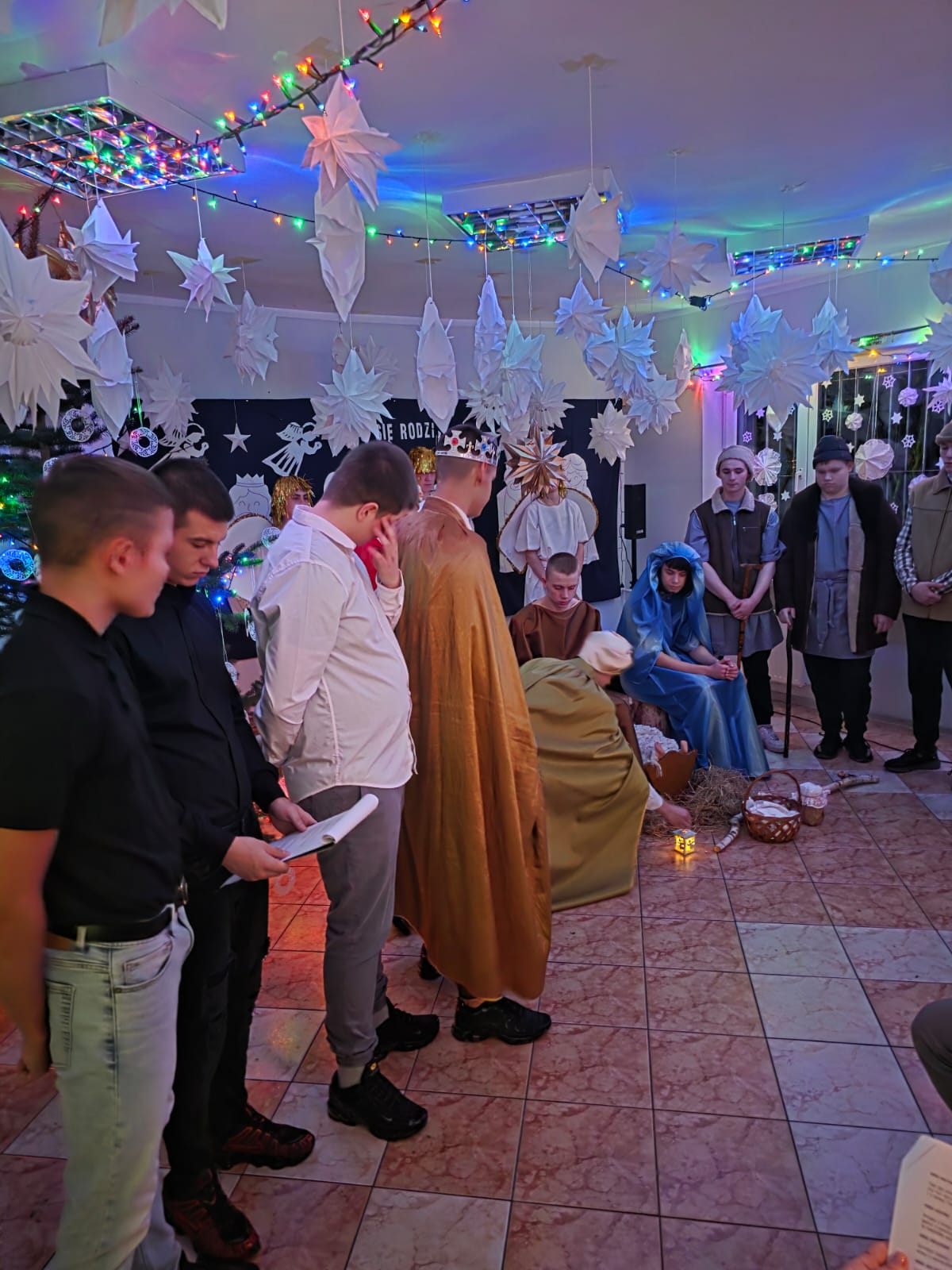 Następnie serca wszystkich poruszyły wystawione Jasełka, przeplatane wspólnym śpiewaniem kolęd. Wychowankowie z pasją odegrali biblijną historię narodzin Jezusa, a świąteczne pieśni wypełniły salę ciepłym, świątecznym duchem. Za sekcję artystyczną odpowiadały Marzena Mikołajczyk i Magdalena Parada, które z wielkim zaangażowaniem przygotowały ten wzruszający spektakl. Nieocenioną pomocą służył Pan Andrzej Beliński, dbając o nagłośnienie i oprawę muzyczną, dzięki czemu wszystko brzmiało idealnie.