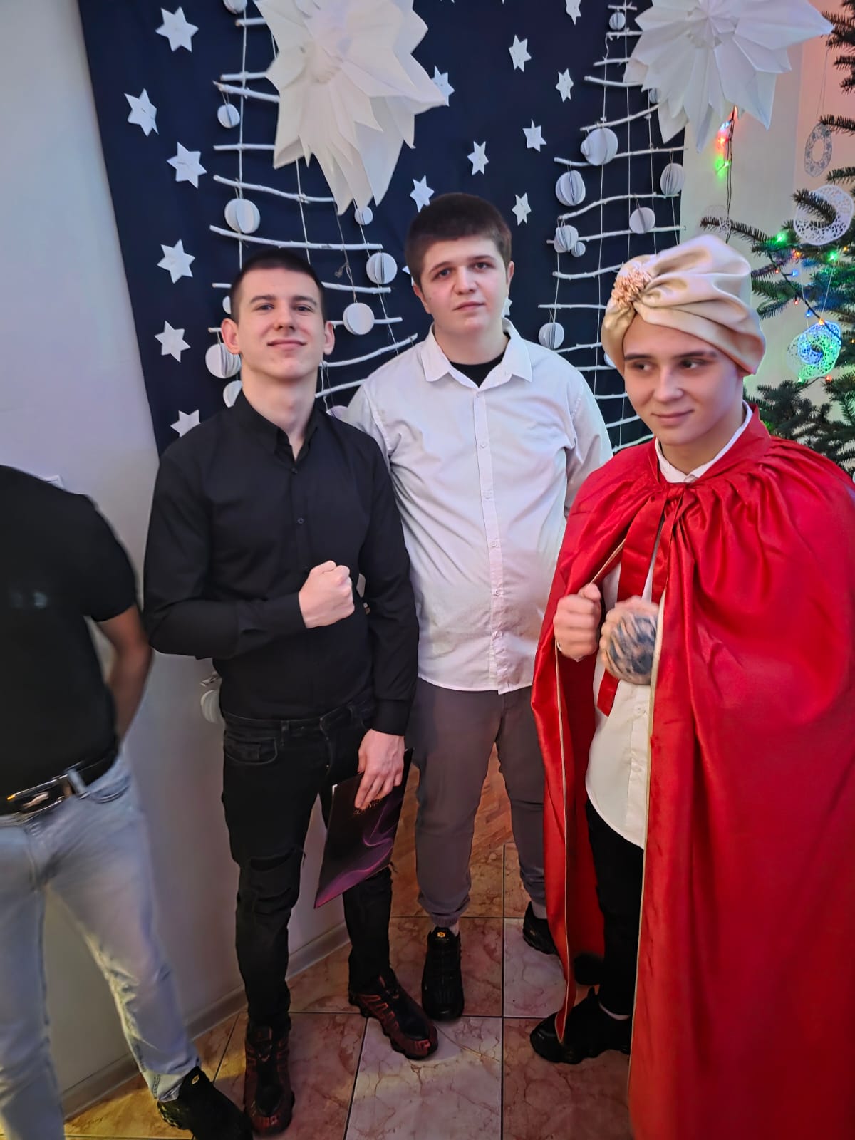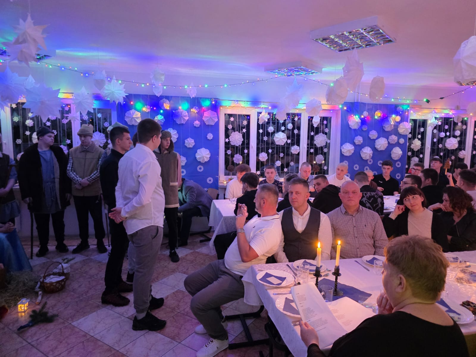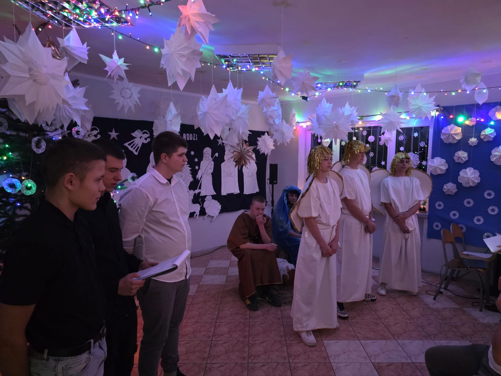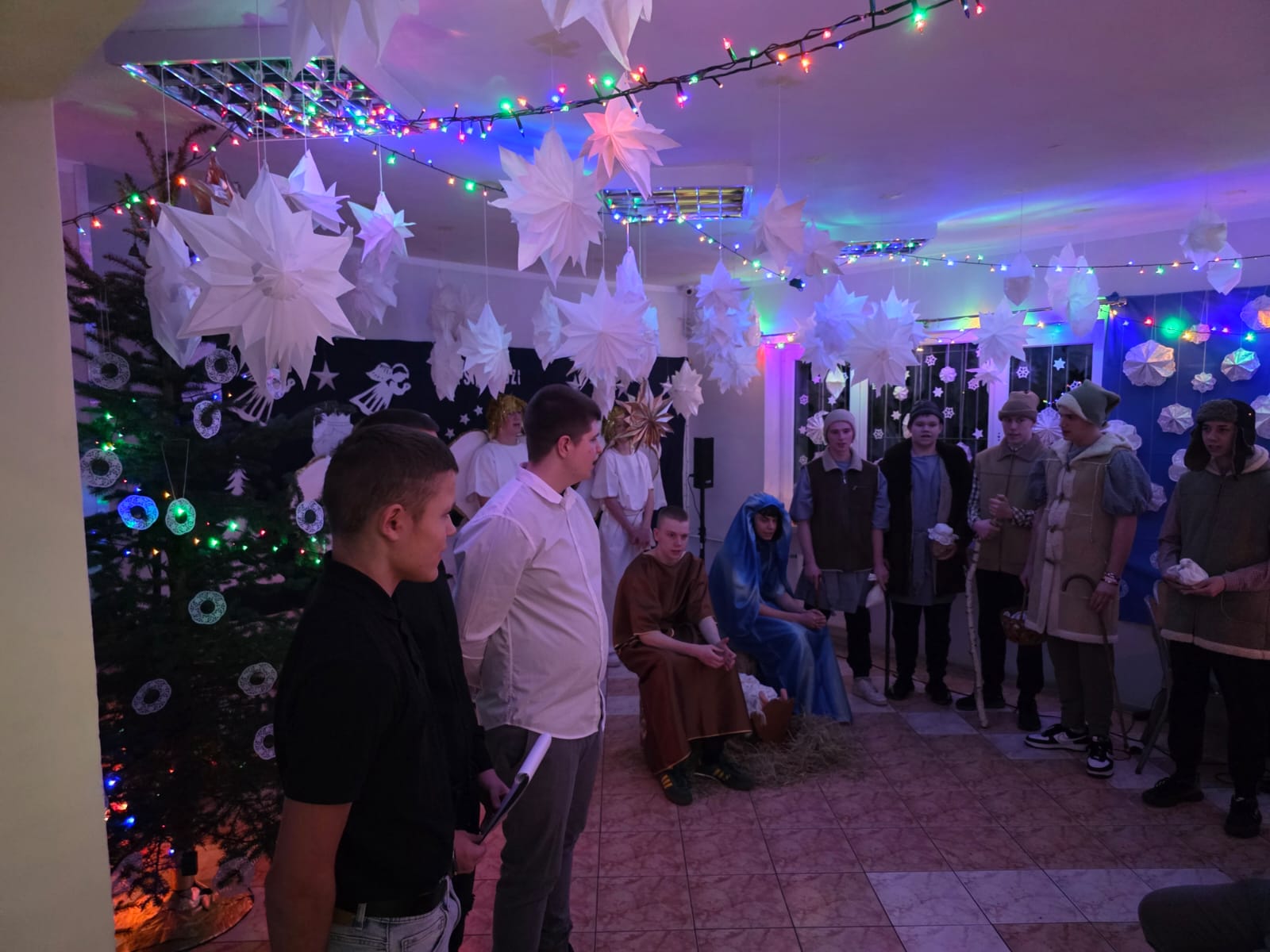 Następnie serca wszystkich poruszyły wystawione Jasełka, przeplatane wspólnym śpiewaniem kolęd. Wychowankowie z pasją odegrali biblijną historię narodzin Jezusa, a świąteczne pieśni wypełniły salę ciepłym, świątecznym duchem. Za sekcję artystyczną odpowiadały Marzena Mikołajczyk i Magdalena Parada, które z wielkim zaangażowaniem przygotowały ten wzruszający spektakl. Nieocenioną pomocą służył Pan Andrzej Beliński, dbając o nagłośnienie i oprawę muzyczną, dzięki czemu wszystko brzmiało idealnie.